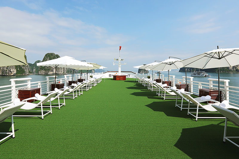 The Halong luxury cruise is proud of the elegant-appointed public areas include a restaurant, two lounges, a library, a gift shop, a spa and a wine cellar. The expansive Sundeck is a haven for relaxation; where passengers mingle into unforgettable Halong Bay scenery on comfortable longer chairs while enjoying a cool drink served from the Uranus Bar. The concept of Starlight Cruise is distinguished from others with the definition of ultimate luxury. We believe that “luxury” should and must be built from every single aspect of a cruise trip, from modern facilities, professional and delightful hospitality onboard, exquisite cuisine, delicate dinning services, exciting excursions and entertaining, etc. Among which, caring, helpful and friendly staffs are the ambassadors of the luxury.