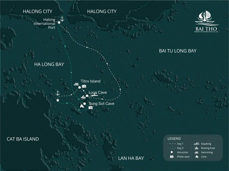 - 14:45 Luon cave – kayaking or bamboo boat. Luon cave excursion on bamboo rowing boat by locals or kayaking. This is one of the must-do activities in the bay.