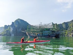 15:00 Join a guide to explore hidden parts of the bay, the area of Dark and Bright cave where to goes through the cave, under the mountain to a lake which is formed by a Karst – well like a dragon eye inside the mountain. This is a very beautiful sight that visitors like the most. You share a sampan with other tourists with a local rower OR taking a kayak on your own.
