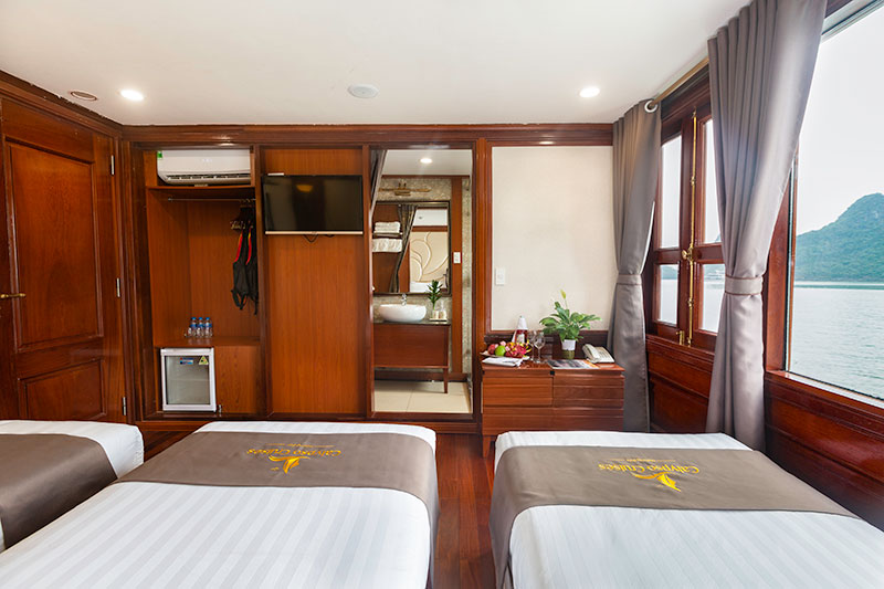 12:15 – 13:00 From Tuan Chau wharf, Tuan Chau island of Halong city, we go to Calypso Cruise by small boat. A warmly welcome drinks will be served upon arrival the cruise then has a short time for check in proceeds: get a brief introduction and safety guidelines then check in.