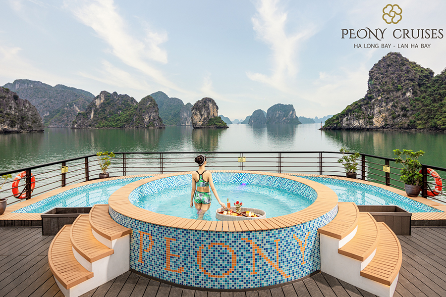 Immerse yourself in the emerald green water of the bay or enjoy the Jacuzzi pool on the Peony Cruises.